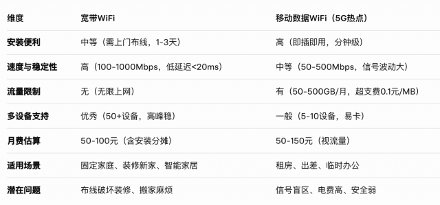 四、宽带 vs移动WiFi:深度优缺点对比